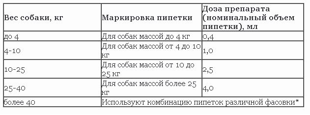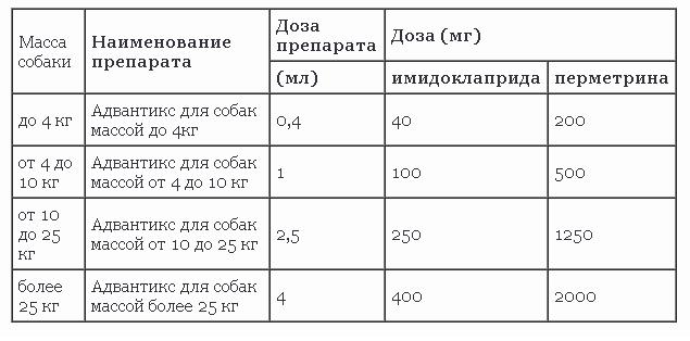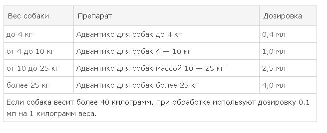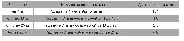 Selon le poids de l'animal, «Advantix (Advantix)» de différents conditionnements est utilisé, aux doses indiquées dans le tableau: