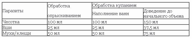 Pour traiter la peau d'un animal de compagnie, 1 ml d'une solution mélangée à 4-5 litres d'eau est utilisé. Nager dans cette composition permettra de se débarrasser complètement des puces et des mangeurs de poux.
