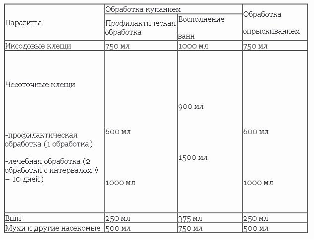 Si le traitement est effectué exclusivement pour la prévention ou pour la destruction des tiques, la concentration de la solution doit être augmentée. Au printemps et en automne, qui sont potentiellement dangereux, un traitement régulier des animaux est nécessaire, il peut être effectué chaque semaine.