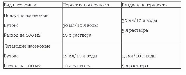 Les instructions pour le médicament indiquent le dosage exact de la substance pour diverses surfaces: pierre, bois, plastique, etc. Si la surface habitable infectée dépasse 100 m², il est recommandé d'acheter Butox dans un emballage de 1 litre.