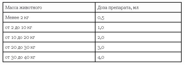 Répartissant les poils, le médicament est appliqué sur la peau de l'animal dans des endroits inaccessibles pour le léchage - dans le cou à la base du crâne ou entre les omoplates aux doses indiquées ci-dessous: