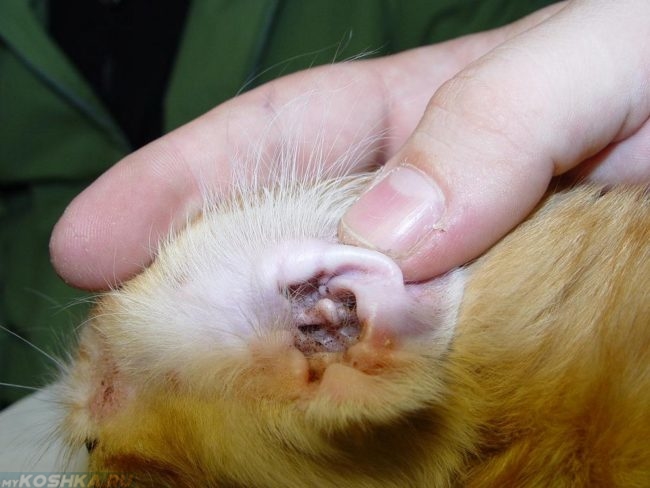 L'acarien est une maladie féline assez courante, les jeunes animaux sont souvent malades. En même temps, le pus s'accumule dans l'oreillette et se recouvre d'une croûte sombre.