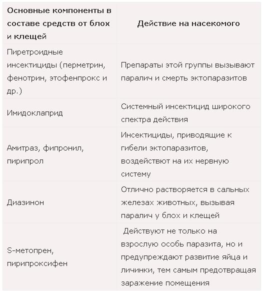 Presque tous les médicaments utilisés pour détruire les puces et les tiques sont l'un ou l'autre insecticide (ou un mélange de ceux-ci). Le plus souvent, les substances toxiques suivantes pour les insectes font partie des gouttes:
