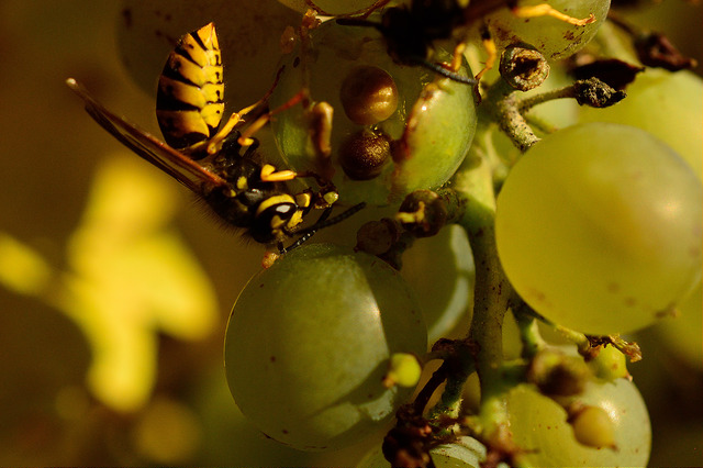 Dans le vignoble, les guêpes se nourrissent de raisins en train de mûrir et sont parfois présentes en si grand nombre qu'elles nuisent gravement à la récolte. Contrairement aux abeilles, les guêpes peuvent ronger la peau fine des baies.