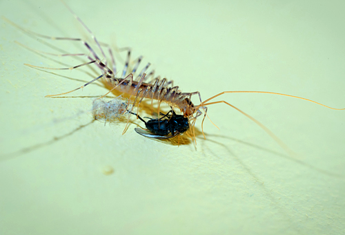 Un mille-pattes est un prédateur qui se nourrit de cafards, de mouches, de limaces, de puces et d'autres petites créatures.Avec une morsure, un mille-pattes sécrète un agent nerveux et mange par la suite une victime immobilisée. En quête de proies faciles, ils se retrouvent dans des maisons et des appartements.