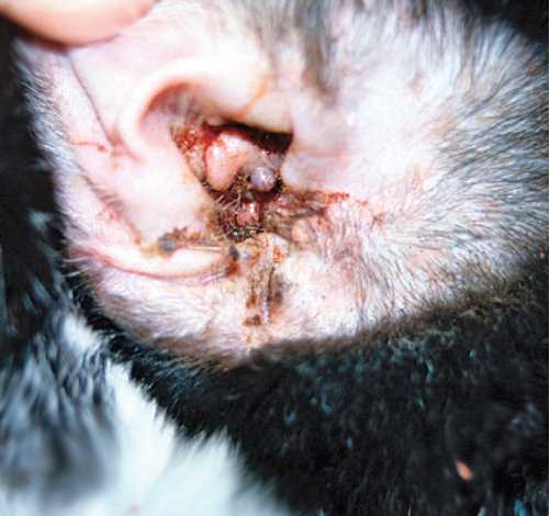La quantité d'exsudat purulent augmente, elle s'accumule dans les plis de l'oreillette, ferme le conduit auditif et devient une odeur putréfactive désagréable.