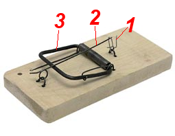 Mettez soigneusement la souricière à la place de l'occurrence probable de «l'ennemi».La souricière fonctionne comme ceci: la souris touche l'appât et déplace la gâchette sur laquelle l'appât est mis, le support glisse hors de la gâchette et relâche le clip, le clip à ressort se ferme, en appuyant fermement (généralement) sur une partie de la souris.