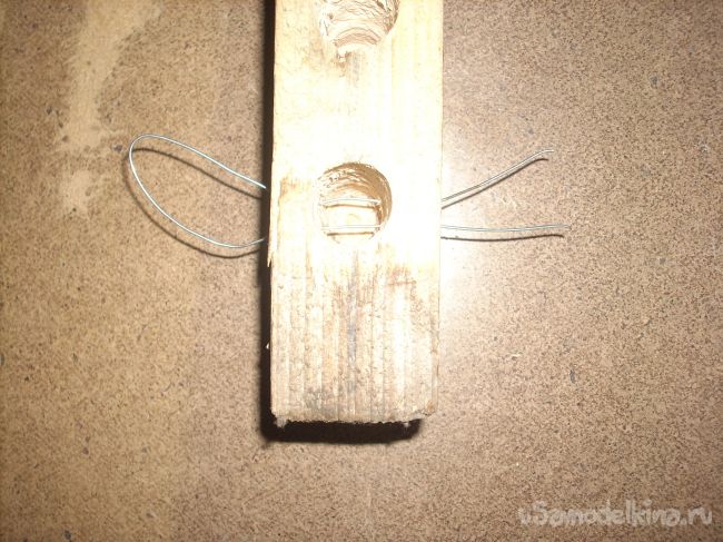 L'étape suivante - à une distance d'environ deux à deux centimètres et demi de notre coupe, nous forons deux trous de 2 mm de diamètre à travers la poutre. Ils doivent traverser chaque vison, le divisant en parties égales. Pour plus de clarté, j'ai inséré un fil dans les trous percés: