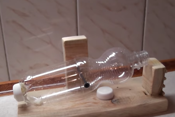 Tenté par l'appât, le rongeur pénétrera facilement le goulot de la bouteille. En conséquence, sous son poids, la structure basculera vers le bas et le bloc avant fermera le cou, bloquant la sortie de la souris.