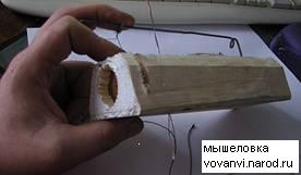 Pour la commodité de charger une souricière, faites une prise d'un diamètre de 20 mm. Insérez-le à travers l'anneau du piège et le trou du piège. Passez une grosse aiguille avec un fil épais à travers le bloc, couvrant la bascule et le bloc à travers deux petits trous.