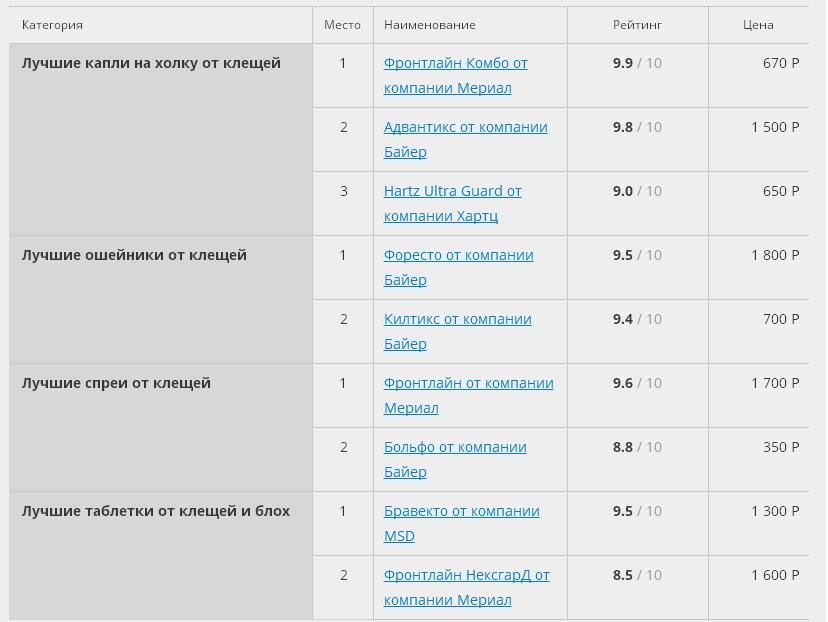Bayer. En première place méritée. Les médicaments allemands ont fait leurs preuves. Ici et gouttes (Advantix) pendant un mois, et cols (Kiltix), et sprays avec shampooings (Bolfo). Les gouttes commencent à agir 12 heures après l'application sur la peau. Les suceurs de sang présents sur l'animal commencent à mourir dès le premier jour.