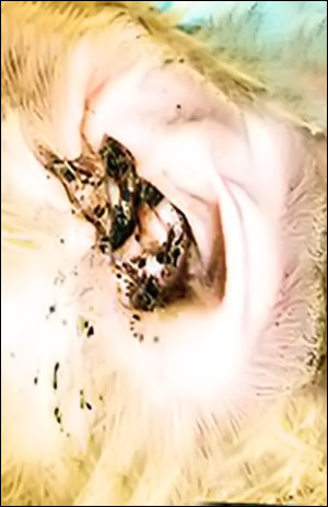 Le liquide se mélange aux déchets d'acariens, forme des croûtes épaisses qui sèchent dans les plis de l'oreille et sentent désagréablement.