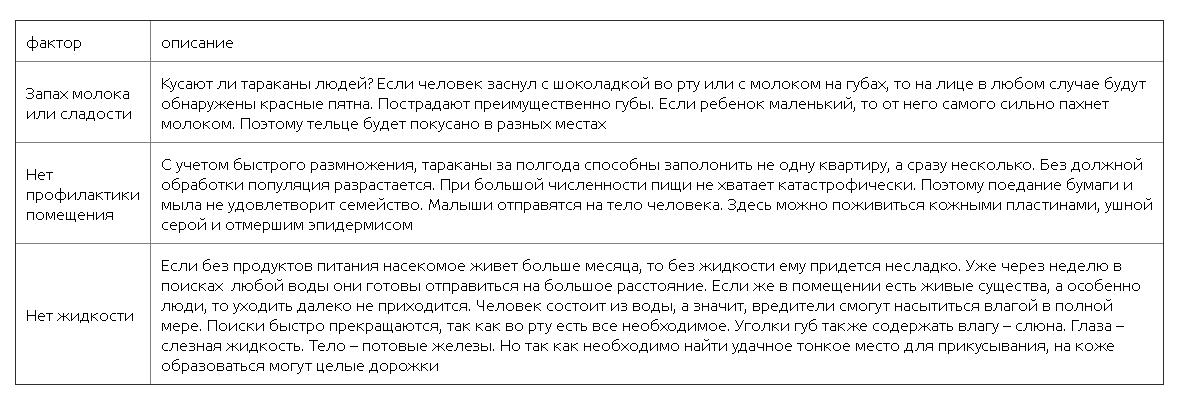 Ainsi, les cafards mordent une personne en cas de pénurie aiguë d'eau ou de nourriture, lorsque leur population intérieure dépasse la quantité de réserves alimentaires. Les cas de piqûres de masse sur les navires sont connus lorsque les marins ont même dû dormir avec des gants, car des insectes affamés mangeaient la peau de leurs doigts.
