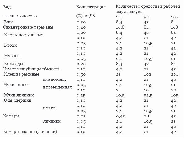 Destruction des larves de moustiques. Pour la destruction des larves de moustiques, une émulsion d'eau à 0,1% (DV) est utilisée à un débit de 50-100 ml / m2. Ils traitent la surface de l'eau dans des réservoirs temporaires (flaques d'eau) qui peuvent se produire lors de la collecte irrégulière des déchets dans les conteneurs.