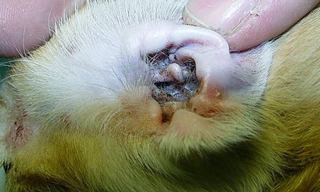 L'inflammation à la surface interne des oreillettes est toujours bien définie et abondamment recouverte d'une masse visqueuse brune avec des croûtes sèches alternées. Cette condition peut durer jusqu'à trois mois et entraîner des complications assez graves. Dans le domaine du microscope, vous pouvez voir jusqu'à 10 parasites vivants.
