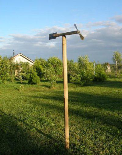 Ce chef-d'œuvre est rendu extrêmement simple. On prend un tuyau métallique creux, une bouteille en plastique vide d'un litre et demi ou deux. Coupe en ciseaux sur les côtés de la lame, comme un moulin ou une girouette. Nous finissons la construction en découpant un trou de diamètre approprié dans le fond de la bouteille et en le mettant sur le tuyau.