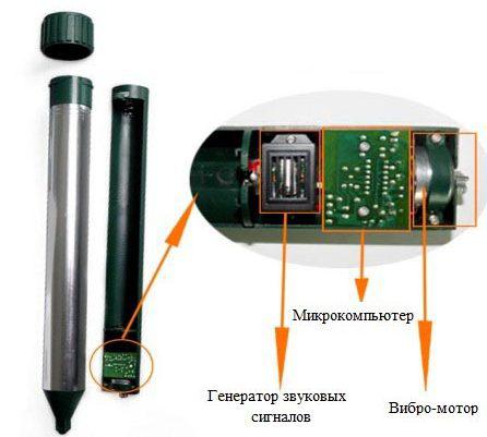 Électronique. Les taupes, comme tous les rongeurs, ressentent le danger, car elles captent les changements dans les fluctuations de la terre. L'action du dispositif électronique vise à envoyer des signaux à l'aide du circuit électronique. Ils sont renforcés par un moteur et peuvent atteindre jusqu'à 45 m. L'intervalle entre les signaux est d'une demi-minute. En conséquence, les animaux commencent à fuir ce rayon.