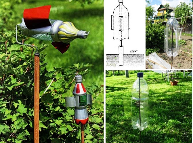 Vous pouvez prendre une bouteille en plastique, approfondir les tiges métalliques dans le sol. Sur les parois du récipient, coupez les lames, qui feront des bruits.