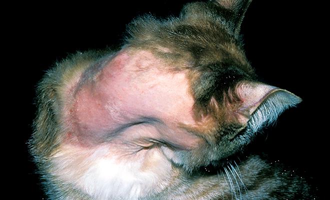 L'activité vitale de la tique sous-cutanée provoque une démangeaison intolérable chez le chat, il gratte les zones touchées, blessant sa peau fine et fine, ce qui entraîne une calvitie locale.