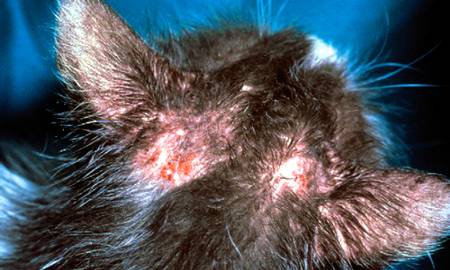 Chez les chats, les principales zones de développement de la maladie sont la zone autour du nez, de la bouche, derrière les oreilles.