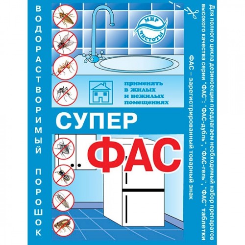 L'agent insecticide hautement efficace Super FAS est une poudre soluble dans l'eau gris clair. L'outil a un effet insectoacaricide aigu (activité résiduelle jusqu'à 6 semaines) pour la destruction des insectes: